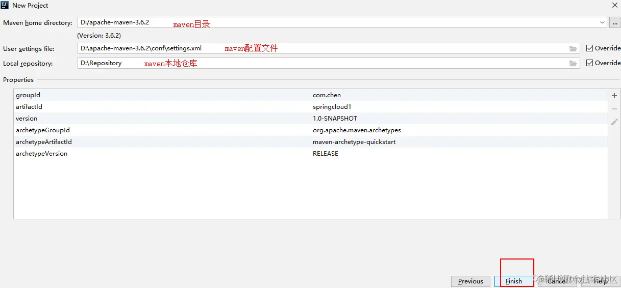 确认Maven目录、配置文件、本地仓库,Finish即可
