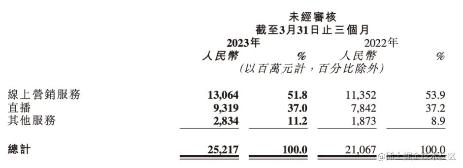 直播算得上是逆势增长,本季度快手播收入93.2 亿元,同比增长 18.8%。之所以说是逆势增长,是因为娱乐直播整体的趋势是往下走的。2019年快手的直播收入能占到总收入的八成。但是随着监管政策的完善等,快手的直播业务营收占比一路从2020年Q3的51.8%降至2023年Q1的37%。
