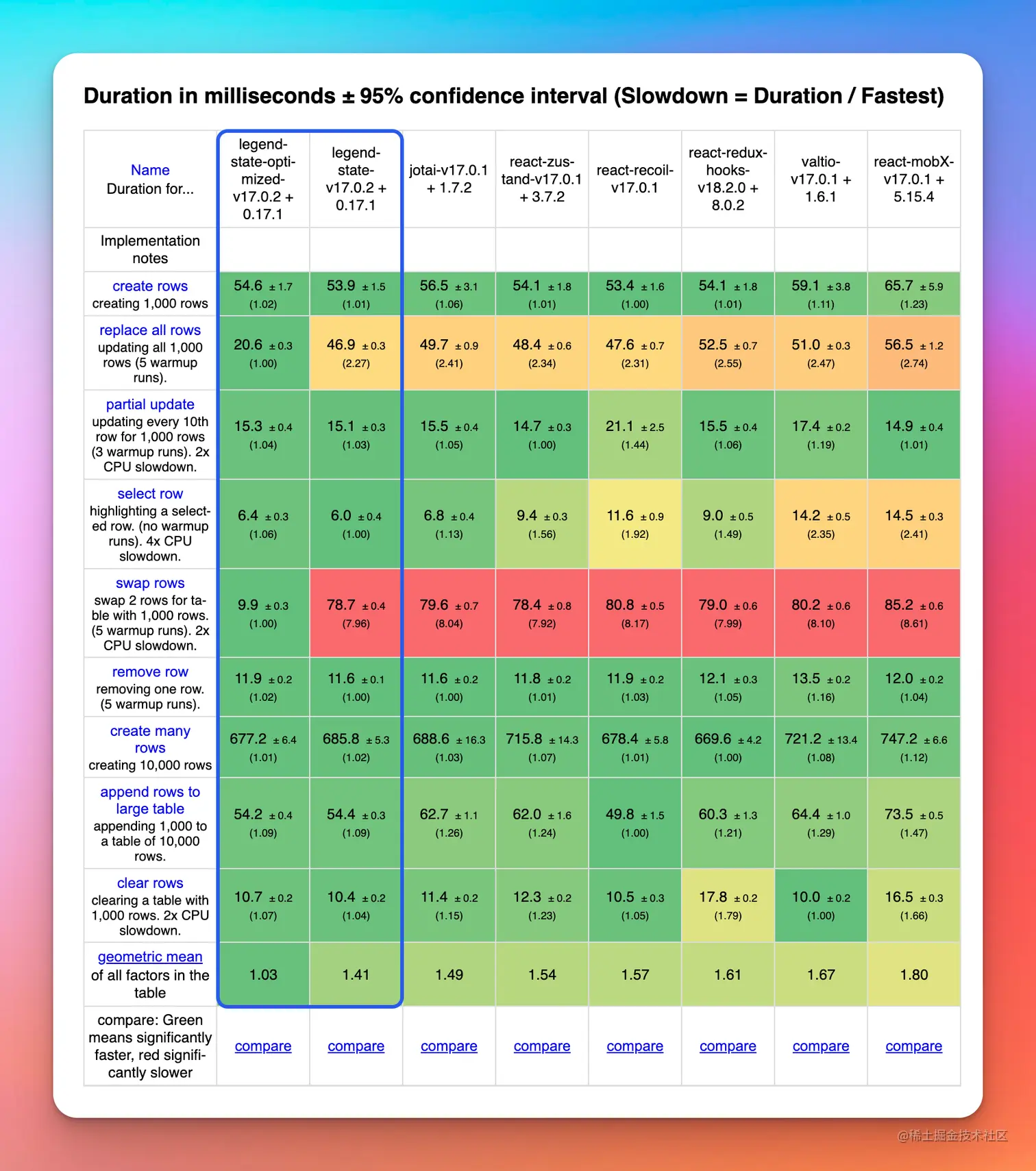 Legend-State 在速度和内存使用方面击败了其他 React 状态库。针对数组的优化模式可以仅重新渲染更改的元素,而不是整个数组,使其比通常使用 React 实现的速度更快 - 在下面的表格中的左侧可以看到来自 krausest 基准测试的情况。