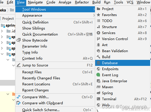 2、如果没有,请点击上方的View(视图)-Tool Windows(工具窗口)-Database。