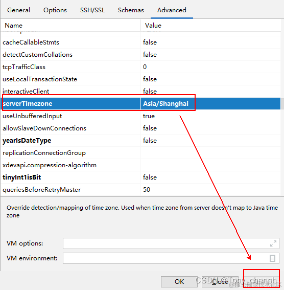 1、直接在advanced上配置serverTimezone属性值(单次连接有效)