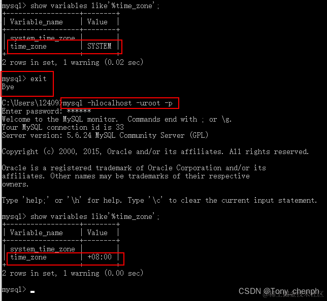 之后,我们需要重新连接数据库,输入mysql -hlocalhost -uroot -p,回车,输入密码,回车,继续输入show variables like'%time_zone'; (注意不要漏掉后面的分号),回车