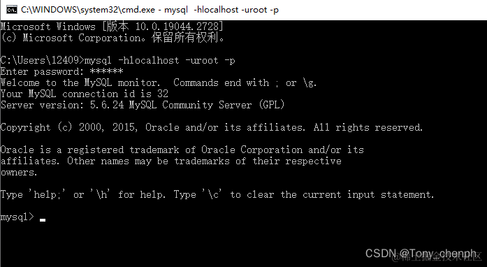 2.2、连接数据库 mysql -hlocalhost -uroot -p--->回车