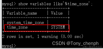 2.4、输入show variables like'%time_zone'; (注意不要漏掉后面的分号)--->回车