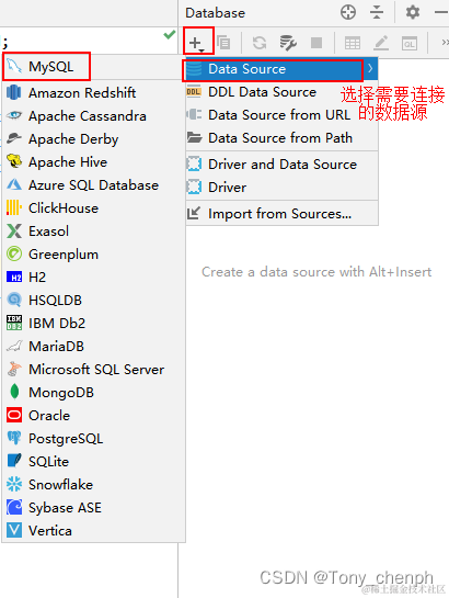 选择需要建立连接的数据源,如MySQL