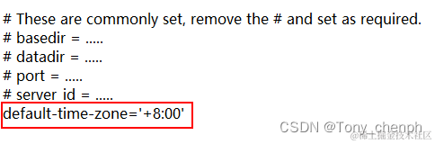 3.1、在自己的MySQL目录下找到my.ini配置文件并打开,在文件中找到下图位置并加上下面这一行default-time-zone='+8:00'