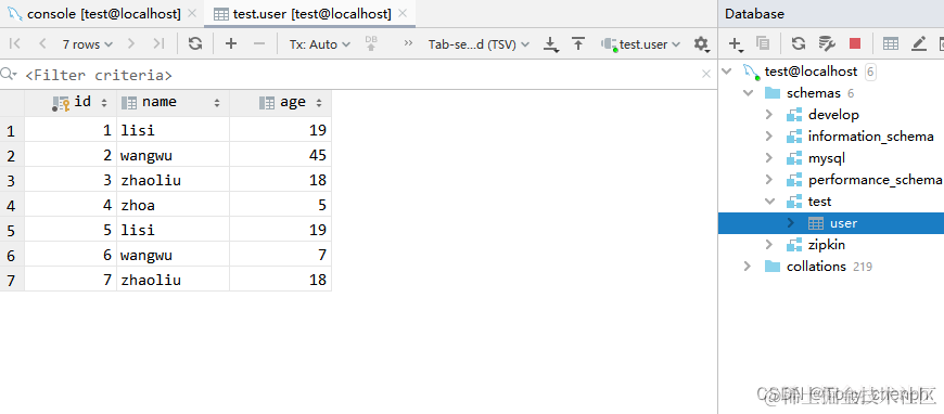 test数据库下当前只有一张user表