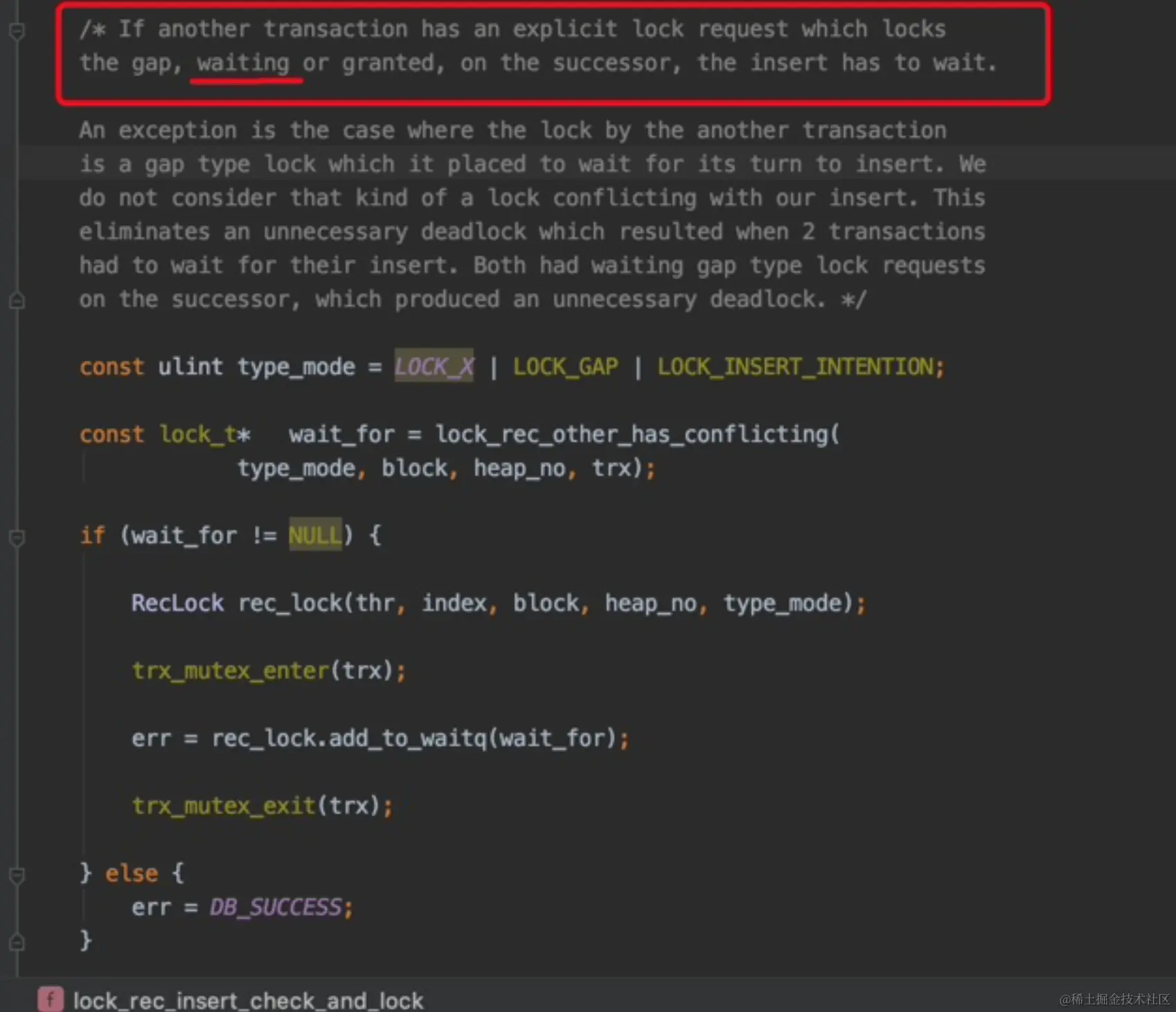 Tips:只要别的事务生成了一个显式的gap锁的锁结构,不论那个事务已经获取到了该锁(granted),还是正在等待获取(waiting),当前事务的INSERT操作都应该被阻塞。