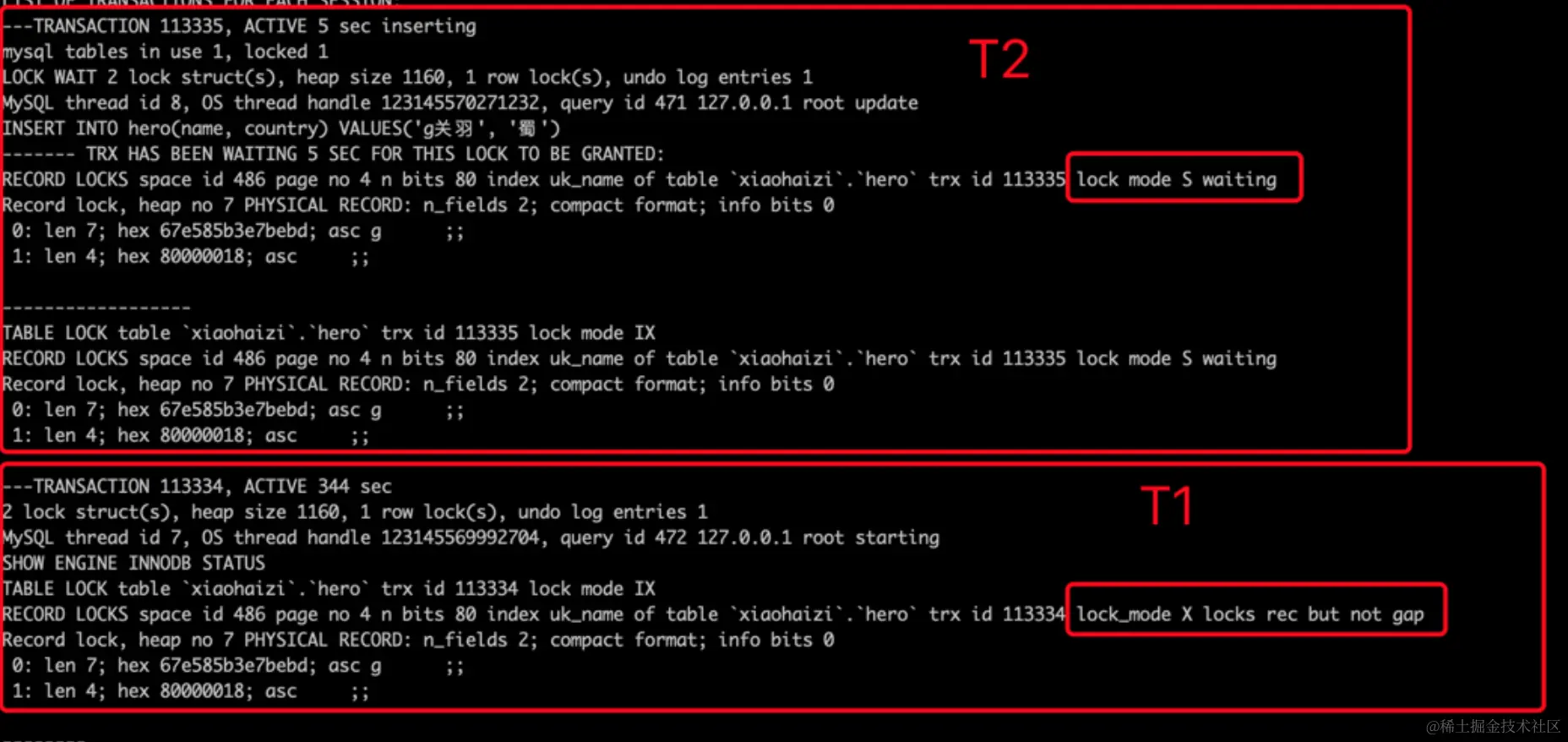- 接着T2也插入name值为 g关羽 的记录。由于T1已经插入name值为 g关羽 的记录,所以T2在插入二级索引记录时会遇到重复的唯一二级索引列值,此时T2想获取一个S型Next-Key Locks,但是T1并未提交,T1插入的name值为 g关羽 的记录上的隐式锁相当于一个X型Record Locks,所以T2向获取S型Next-Key Locks时会遇到锁冲突,T2进入阻塞状态,并且将T1的隐式锁转换为显式锁(就是帮助T1实现隐式锁转换)。