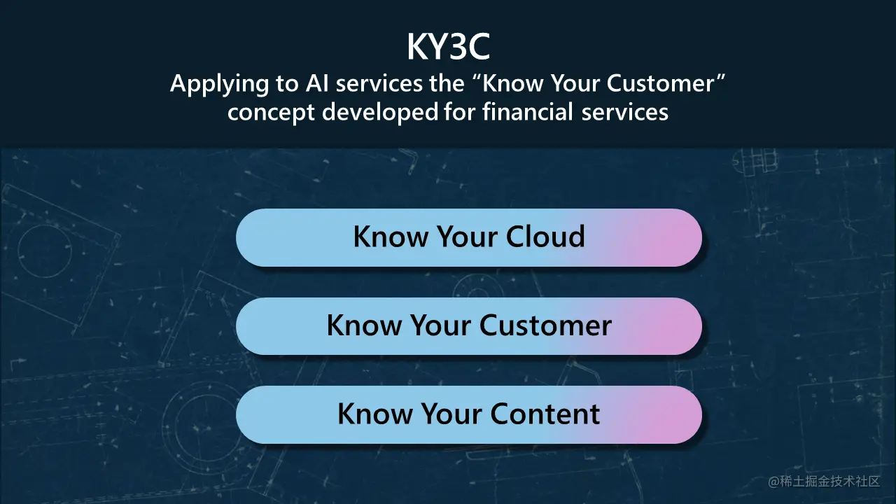 在此过程中,该蓝图部分建立在银行业近几十年来制定的一项原则之上,该原则旨在防止洗钱和犯罪分子或恐怖分子利用金融服务。“了解你的客户”(或 KYC)原则要求金融机构验证客户身份、建立风险概况并监控交易以帮助检测可疑活动。采用这一原则并应用 KY3C 方法是有意义的,该方法在 AI 上下文中创建了解自己的云、客户和内容的某些义务。