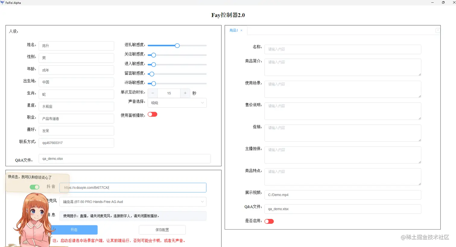 - 数字人互动:fay控制器(麦克风输入源开启、展板播放关闭、填写性格Q&A)+ 数字人;
