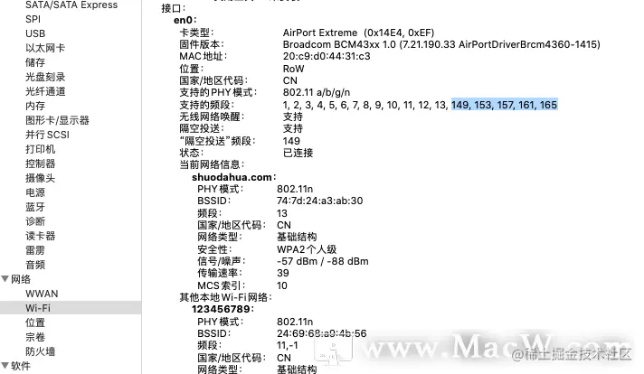 按照我的MBP中支持的WIFI网络,应该可以支持149, 153, 157, 161, 165五个频段,如图: