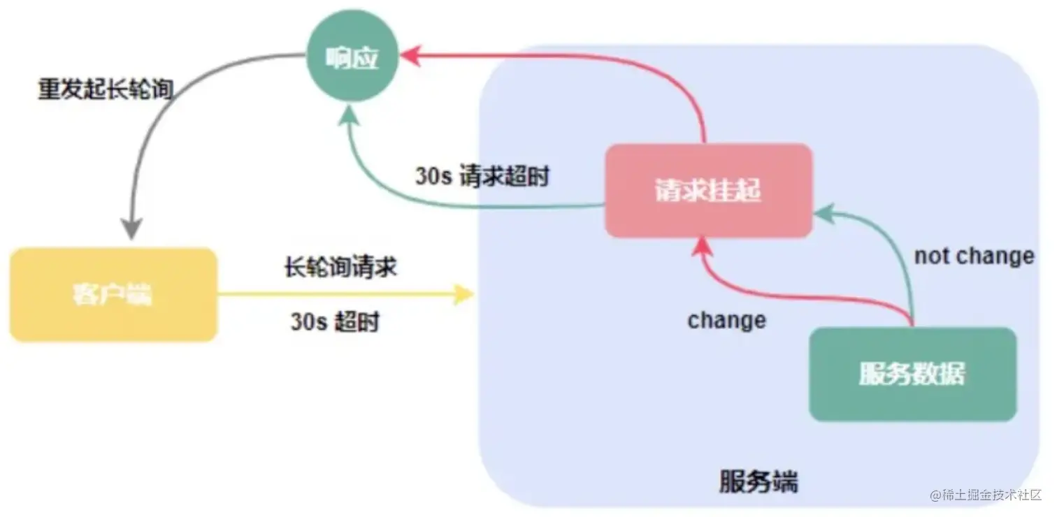 - 服务端的压力减小,客户端发起长轮询,如果数据没有发生变更,服务端会hold住此次客户端的请求,hold住请求的时间一般会设置到30s或者60s,并且服务端hold住请求不会消耗太多服务端的资源。