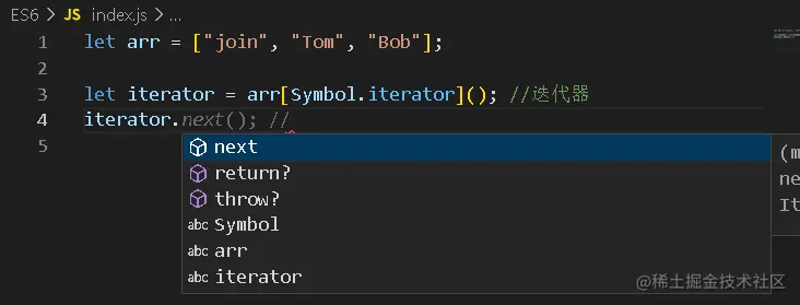 let iterator = arr[Symbol.iterator](); //迭代器