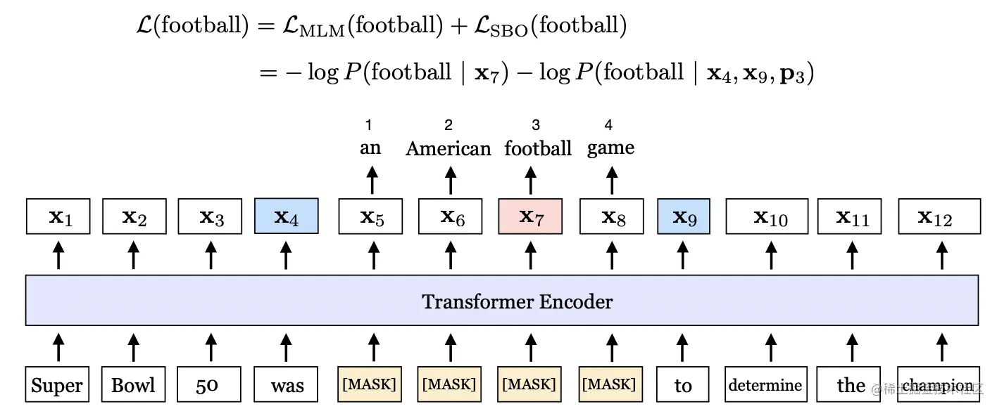 如上图所示, 在预测单词football的时候,即使用了MLM任务去预测单词football,同时又使用了SBO任务去预测football,最终将二者进行相加。相应公式为:
