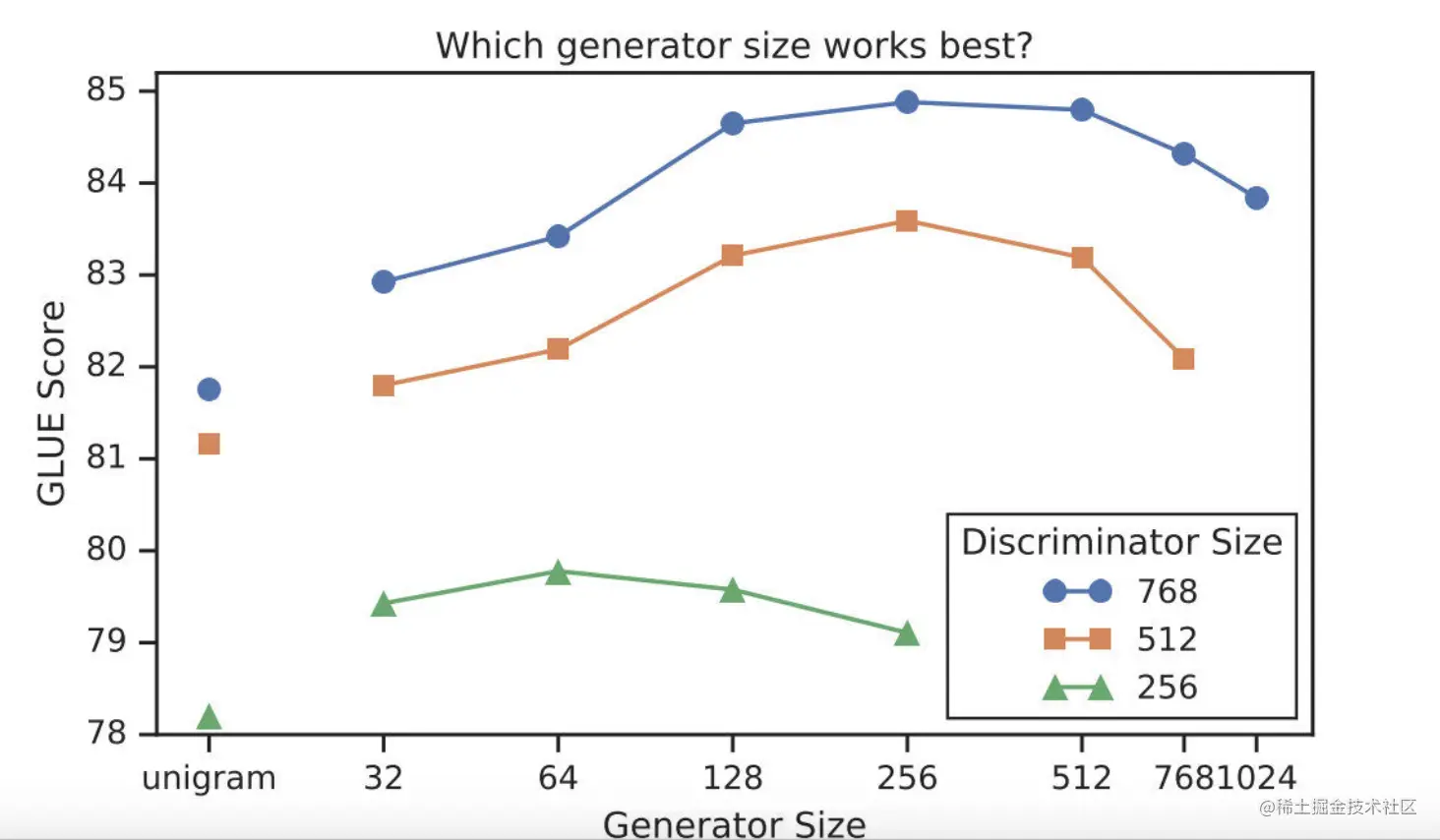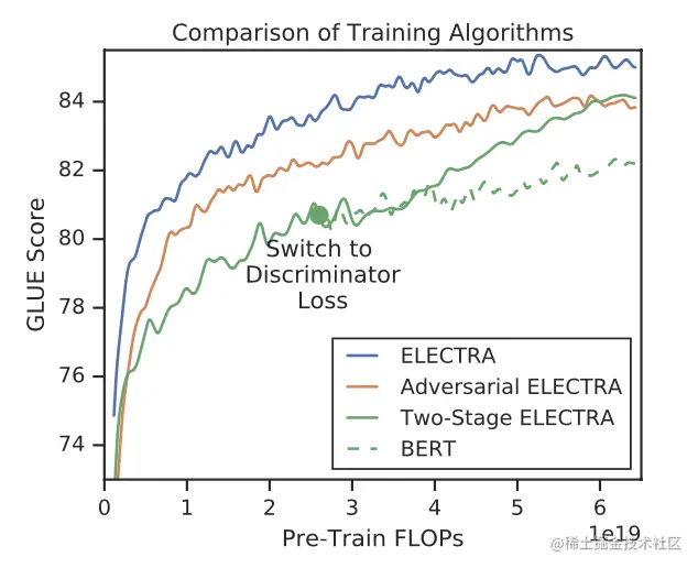 另外,在优化判别器时计算了所有token上的损失,而以往计算BERT的MLM loss时会忽略没被mask的token。作者在后来的实验中也验证了在所有token上进行损失计算会提升效率和效果。