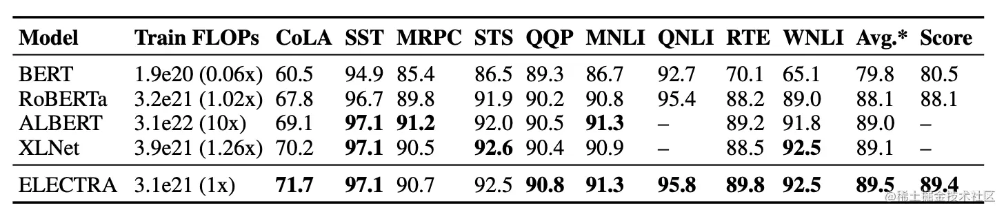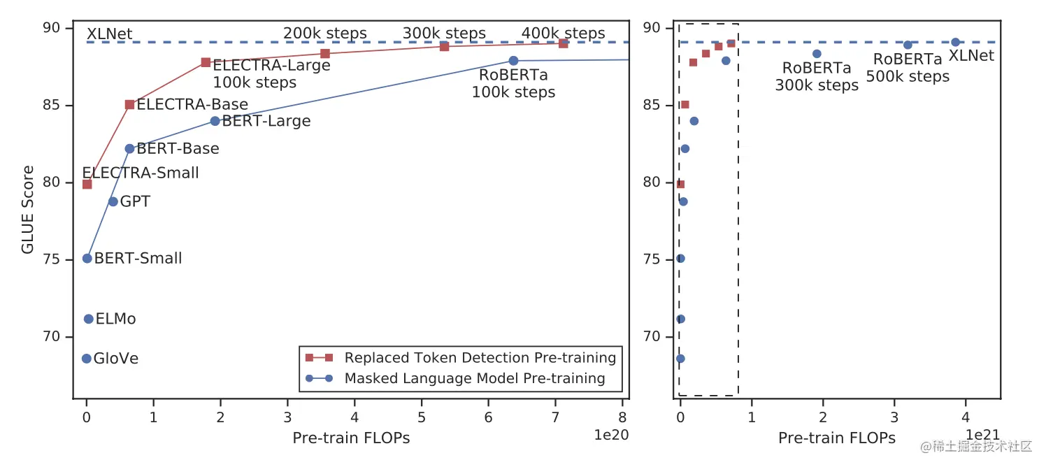 上图中,左边的图是右边的放大版,纵轴是dev GLUE分数,横轴是FLOPs(floating point operations),Tensorflow中提供的浮点数计算量统计。从上图可以看到,同量级的ELECTRA是一直碾压BERT,而且在训练更长的步长步数,达到了当时的SOTA模型RoBERTa的效果。从左边的曲线图上可以看到,ELECTRA效果还有继续上升的空间。