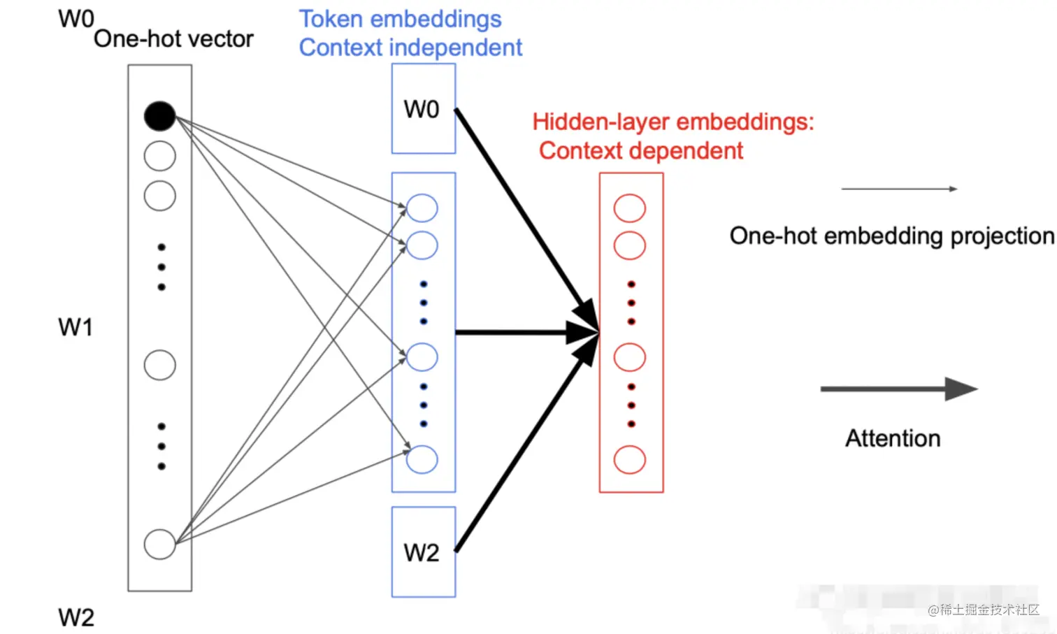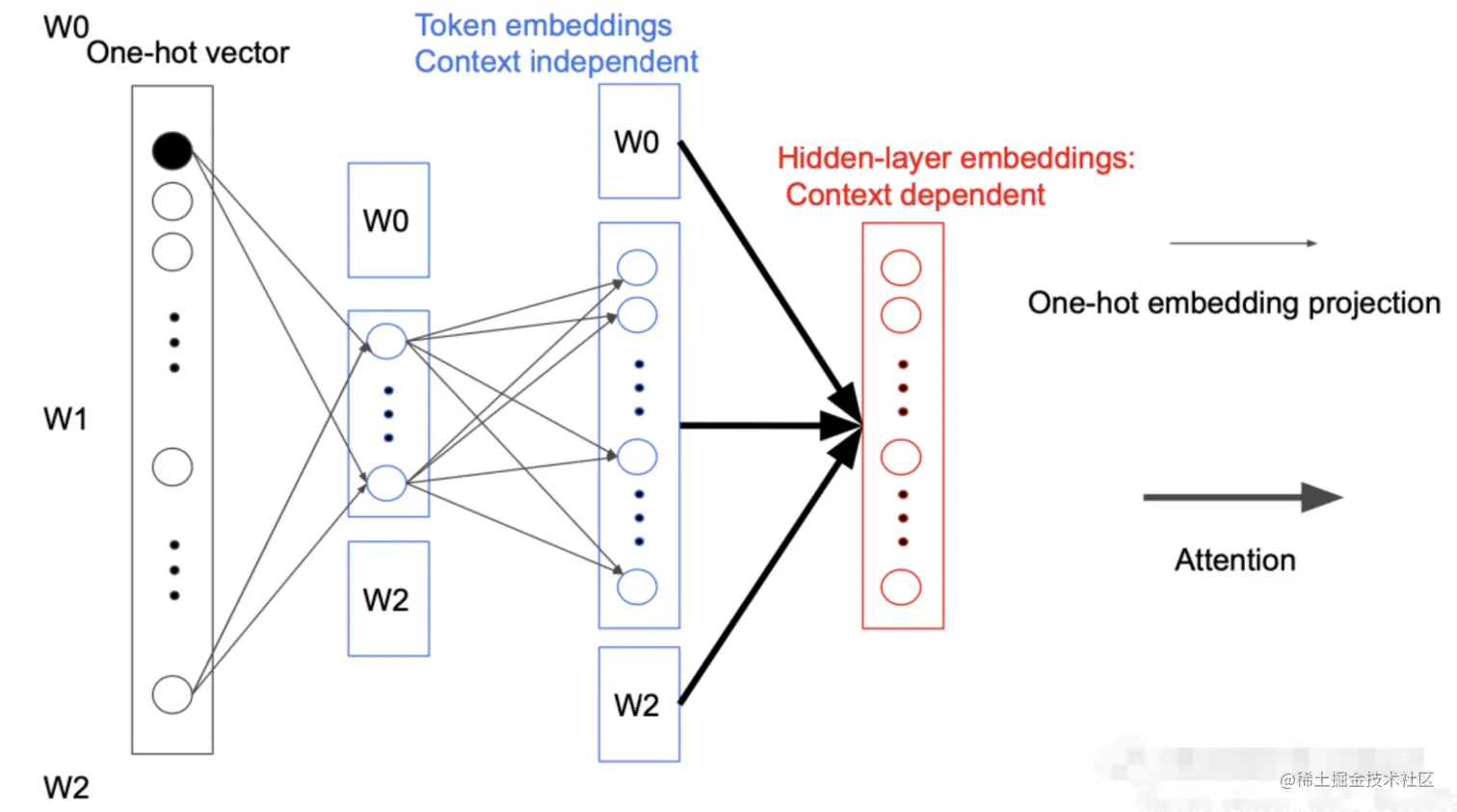 之所以可以这样做是因为每次反向传播时都只会更新一个 Token 相关参数,其他参数都不会变。而且在第一次投影的过程中,词与词之间是不会进行交互的,只有在后面的 Attention 过程中才会做交互,我们称为 Sparsely updated。如果词不做交互的话,完全没有必要用一个很高维度的向量去表示,所以就引入一个小的隐藏层。