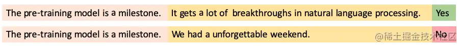 在BERT的训练语料中,部分输入文本是由无关的两段语句进行拼接而成,部分输入文本是由本来就前后相邻的两段语句拼接而成。NSP任务旨在去识别一个输入文本是否是相邻的两句话拼接而成。图3给出了关于NSP的一个语料文本示例。