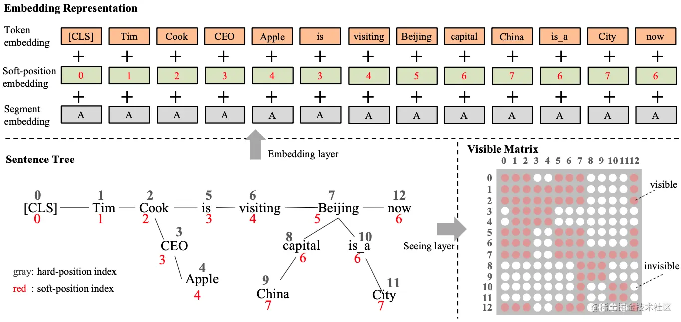 基于这些考虑,KBERT 提出了 soft-position 和 visible matrix 两种技术解决这些问题。这些将会在以下两小节中进行展开讨论。