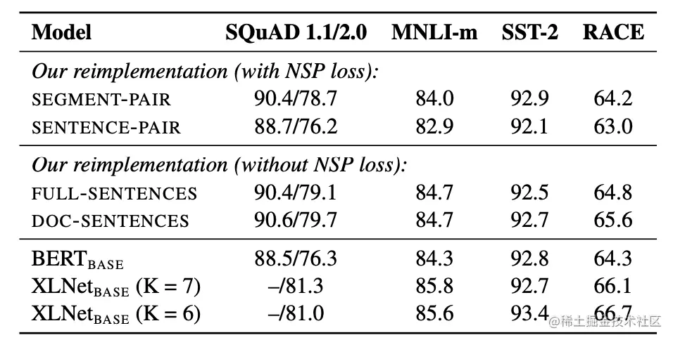 然而,RoBERTa通过实验发现,去掉NSP任务将会提升down-stream任务的指标,如图2所示。