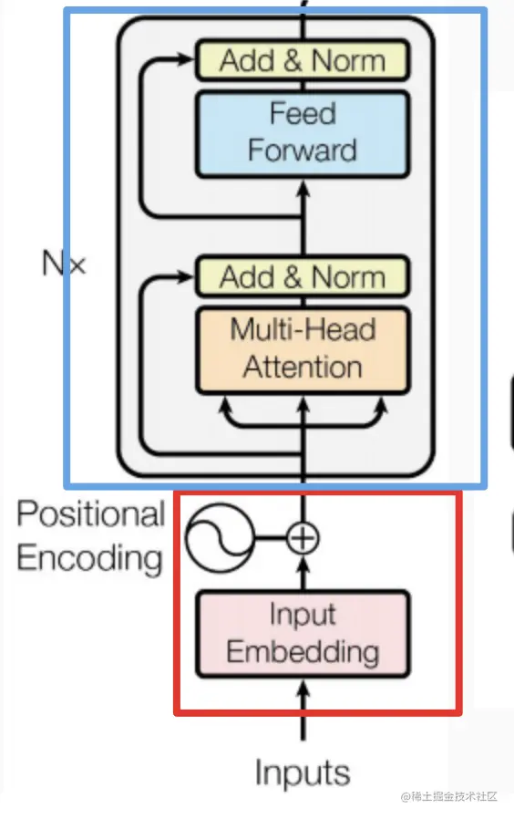 以下图为例可以看到模型的参数主要集中在两块,一块是 Token embedding projection block,另一块是 Attention feed-forward block,前者占有 20% 的参数量,后者占有 80% 的参数量。