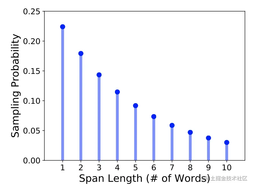 具体来讲,首先SpanBERT根据几何分布采样一个Span的长度,该几何分布倾向于选择短Span。然后在文本中随机选择起始点,即从起始点开始的长度token将会被Mask。图4展示了Span采样长度图。