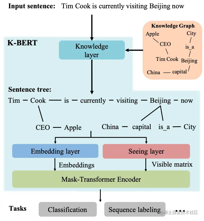 对于输入的文本序列,KBERT 会根据序列中存在的实体,在 Knowledge Graph (KG) 中找到相应的 fact,例如 < Cook, CEO, Apple>,然后在 Knowledge layer 中进行融合,并输出相应的 Sentence tree。然后将其分别输入至 Embedding layer 和 Seeing layer 后分别得到 token 对应的 Embedding 和 Visible matrix, 最后将两者传入 Mask-Transformer Encoder 中进行计算,并获得相应的输出向量。这些输出向量接下来将被应用于下游任务,比如文本分类,序列标注等。