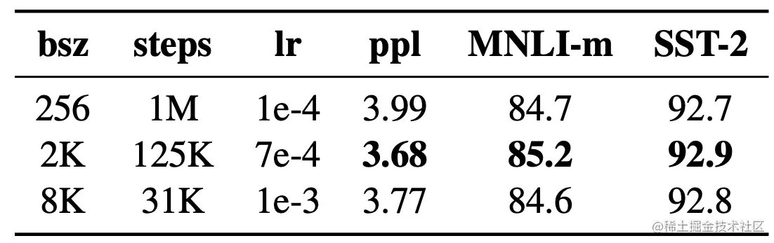 RoBERTa通过增加训练过程中Batch Size的大小,来观看模型的在预训练任务和down-stream任务上的表现。发现增加Batch Size有利于降低保留的训练数据的Perplexity,提高down-stream的指标。