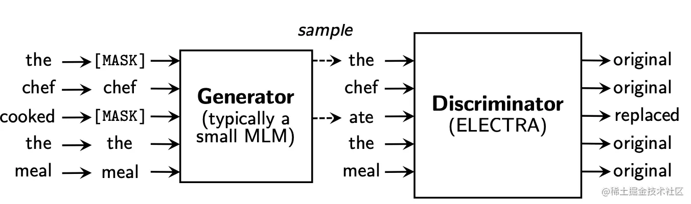 事实上,ELECTRA使用的生成-判别架构与GAN还是有不少差别,作者列出了如下几点: