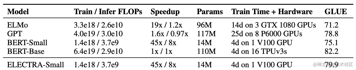作者的目的是提升预训练效率,于是做了GPU单卡就可以训练ELECTRA-Small和BERT-Small,接着和层数不变的ELMo、GPT等进行对比。结果如下: