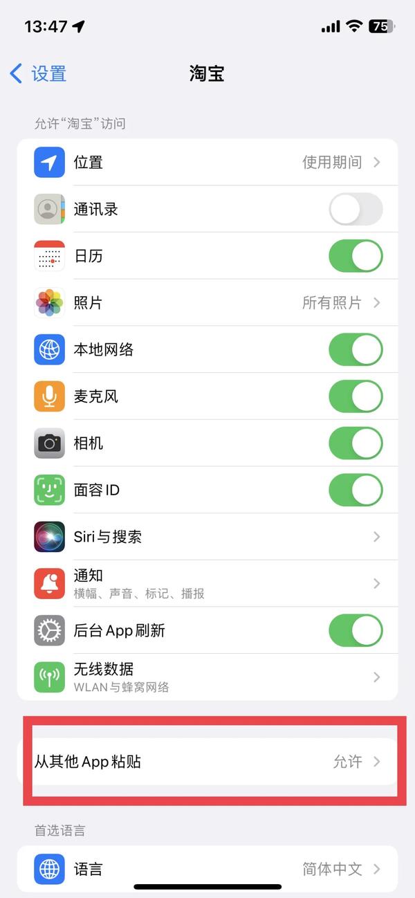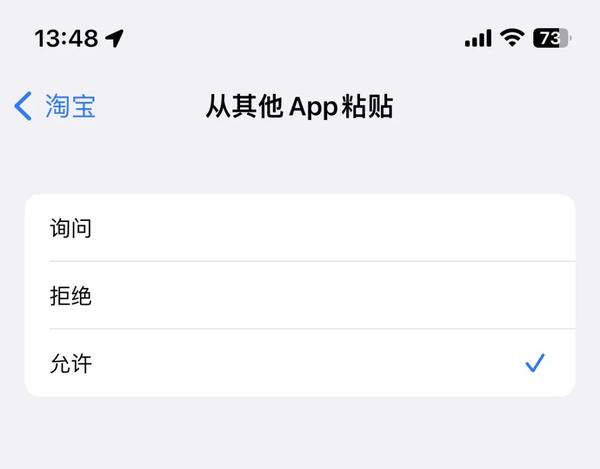 默认情况下,App 每次访问剪切板都会弹出这个权限询问弹窗(即使某一次你点了允许或拒绝),那作为用户怎么一次性设定某个 App 允许或者拒绝呢?可以打开系统设置,下拉找到这个 App,比如淘宝,点开之后会出现权限列表,页面底部会有一个从其他 App 粘贴的选项,点进去之后,可以为这个 App 设置永久的粘贴板访问权限。