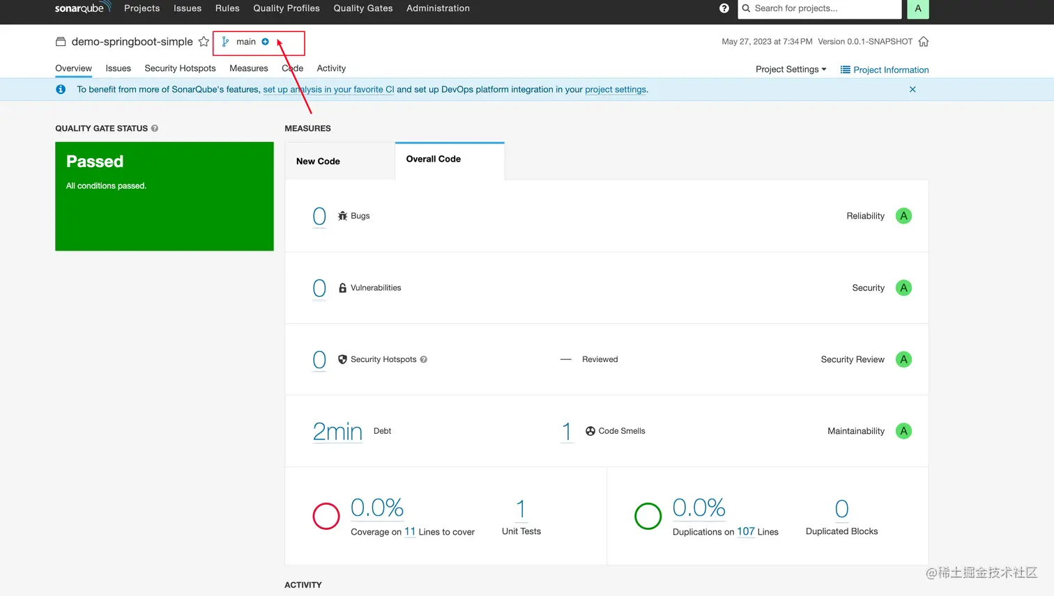 执行完成之后在 SonarQube对应项目的界面上就能看到,有了不同分支的切换