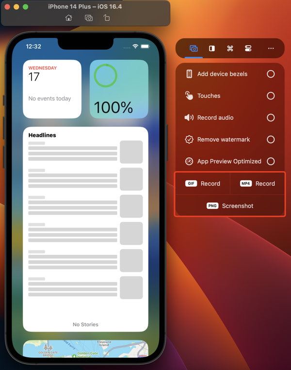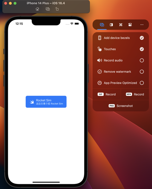 RocketSim 支持录制 Gif 动图和 MP4 视频,分别点击菜单栏下方的 GIF Record 和 GIF Record 按钮即可,后续操作同截图一致。