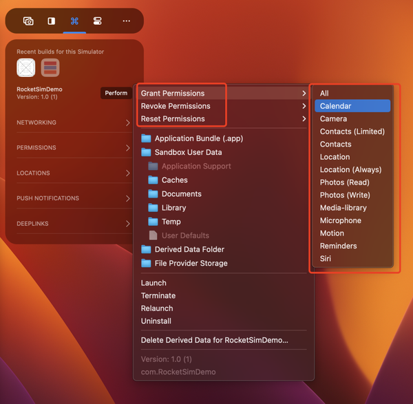 RocketSim 方便管理 App 的权限,在 Permission 菜单里,可以对某一个权限进行授予、撤销和重置操作。
