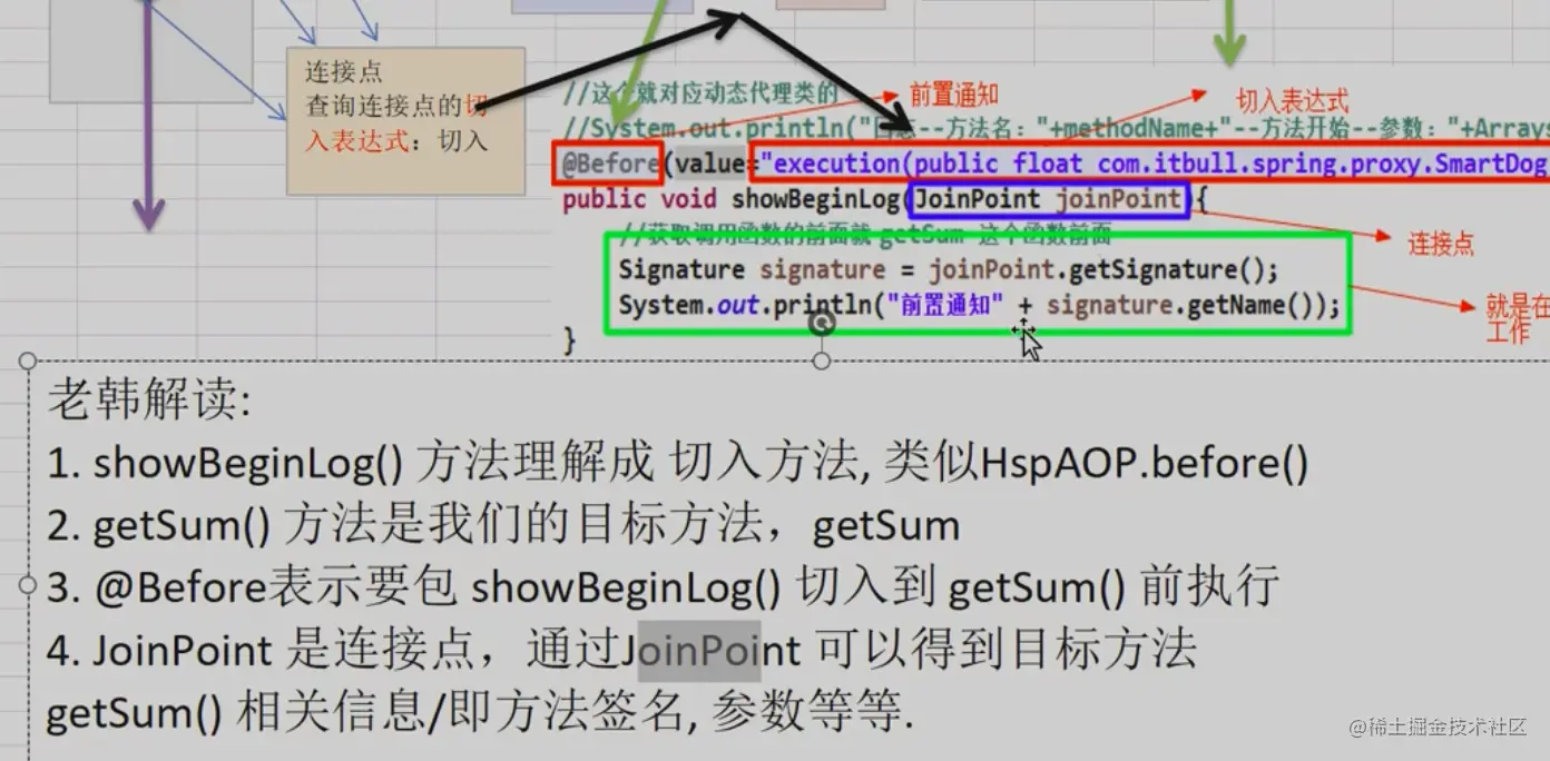 joinPoint.getThis()可以获取代理对象,即实际执行方法的对象。 - proceed():继续执行方法。在环绕通知(Around Advice)中,使用
