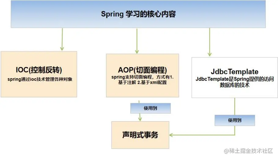 - Spring 核心学习内容 IOC、AOP, jdbcTemplate, 声明式事务