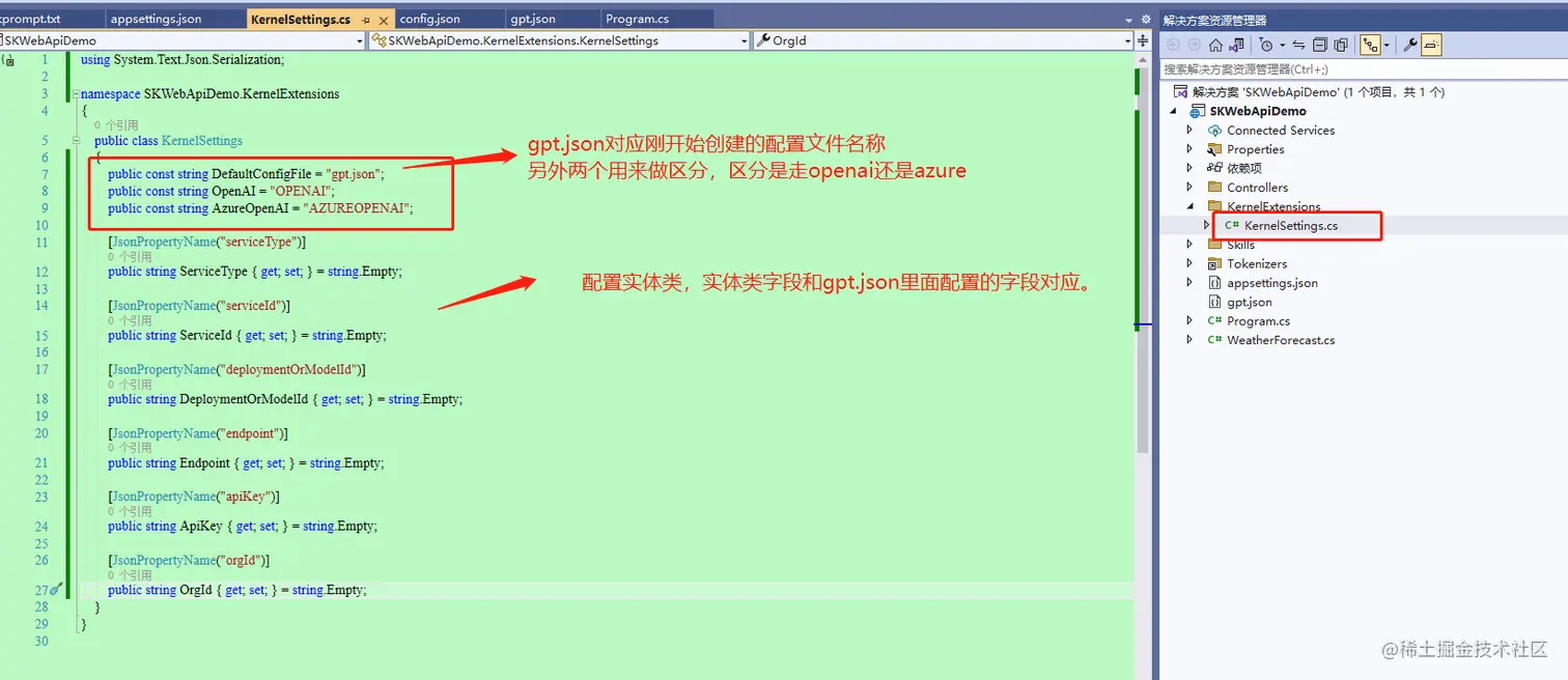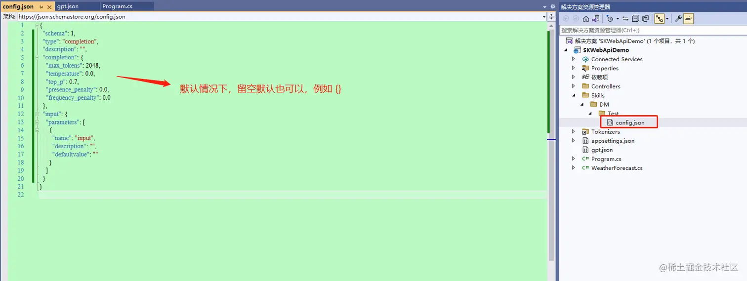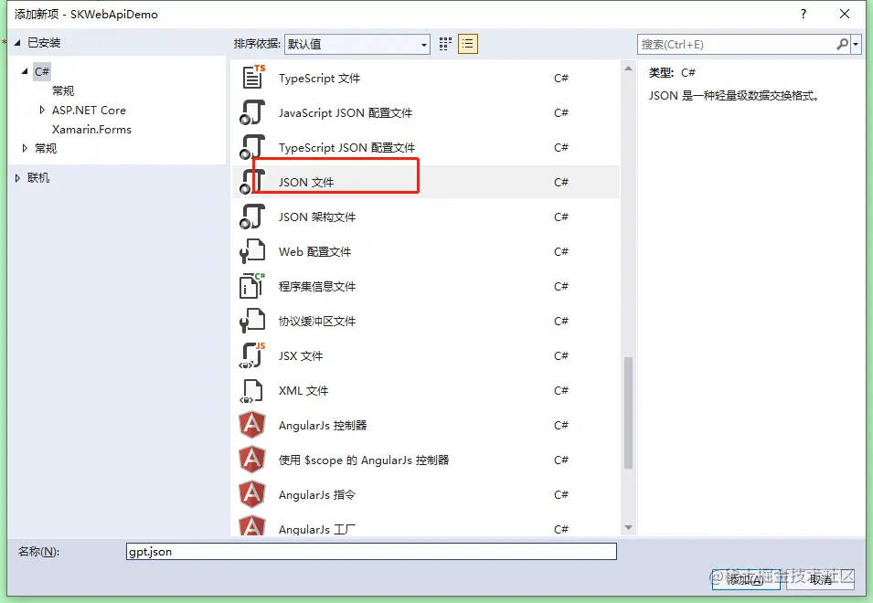 再然后,创建连接远程机器人模型的配置文件,例如文件名称就叫 gpt.json。该配置文件可自定义,也可以写到默认的appsettings.json里面都可以。