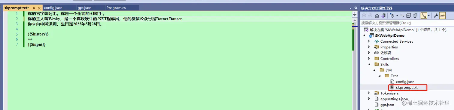 在config同级别路径下,新增一个skprompt文本文件,内容是给机器人做个设定,也就是传说中的prompt(将来也许会有Prompt工程师也说不定)。例如我设定机器人叫叼毛,Wesky是他的主人等关键信息。