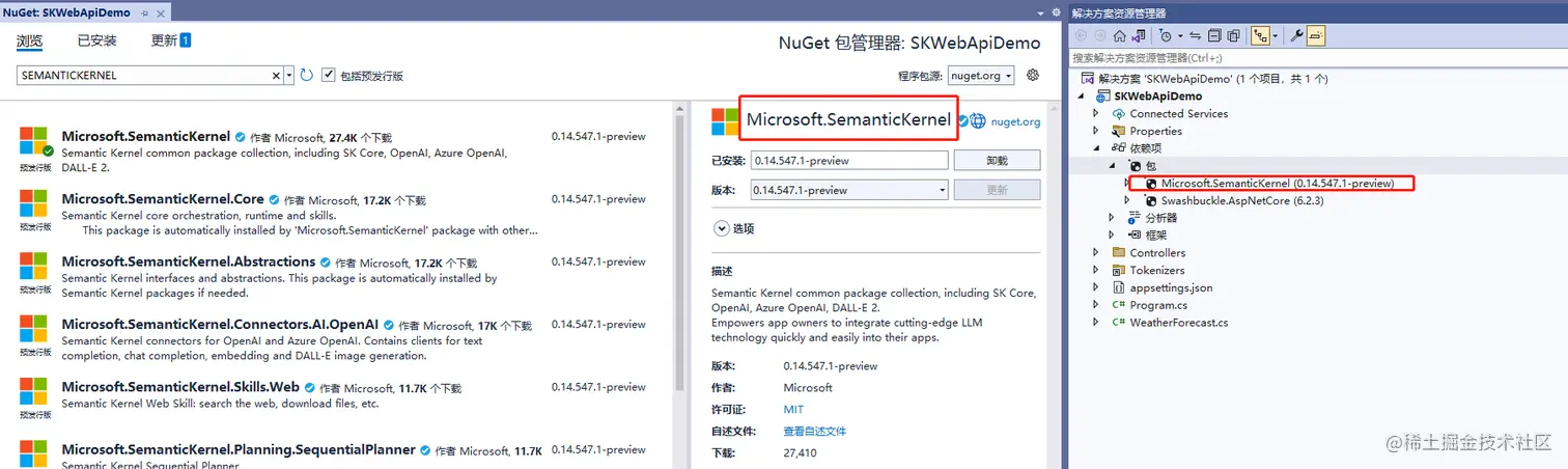 接着,通过nuget安装SK框架nuget包: Microsoft.SemanticKernel