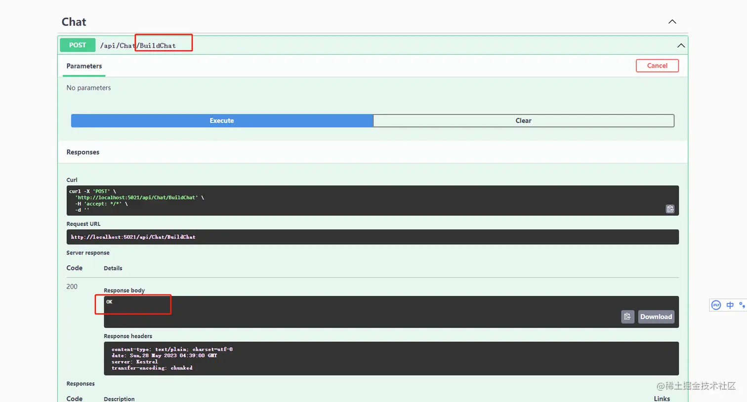 最后,运行程序,默认打开swagger页面,先调用执行初始化接口(BuildChat)