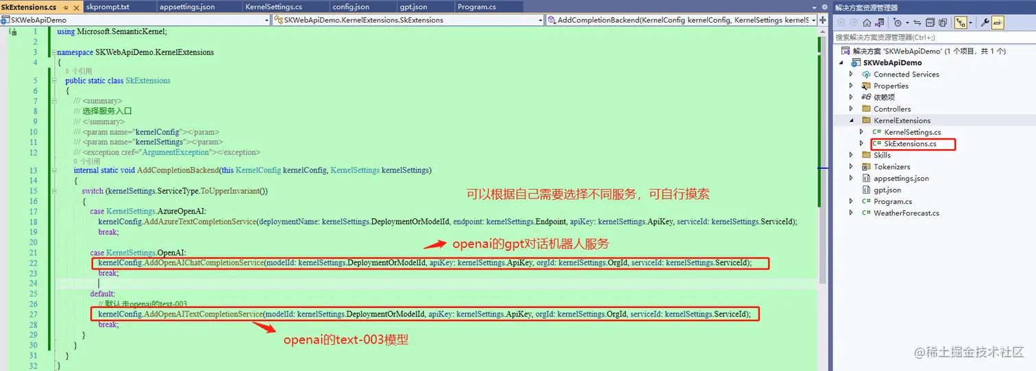 新增一个拓展类,用来根据配置的服务,选择进入不同的服务商。也可以再根据配置的模型不同,进入不同的服务调用入口,此处为了简单,就先写死了,并提供了一个走azure openai的通道,供大家备用。