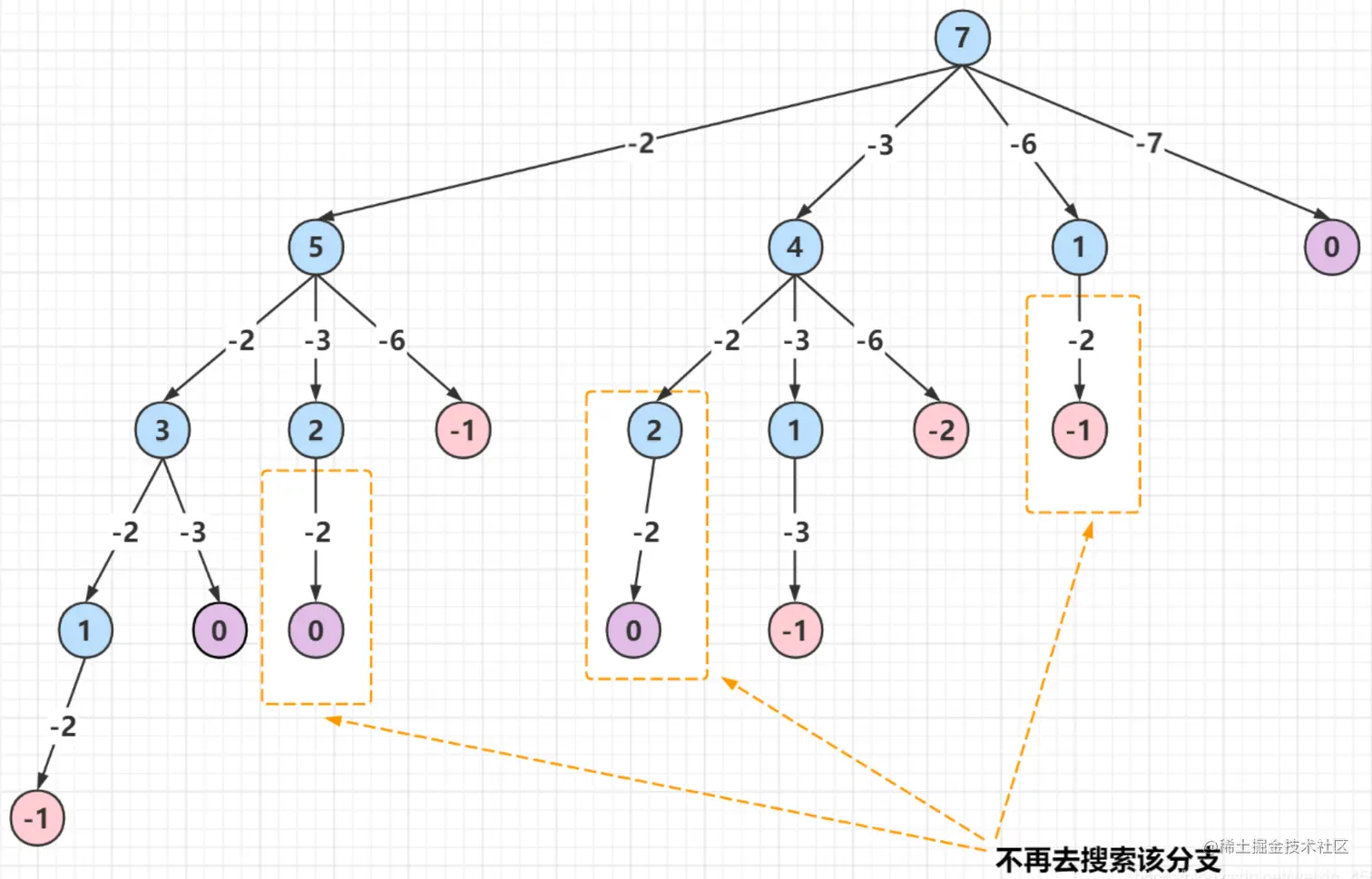 但是由于题目要求返回和为target的不同组合,因此[2,2,3]、[2,3,2]、[3,2,2]为重复方案。为了避免搜索过程中的重复方案,我们要去定义一个搜索起点,已经考虑过的数,以后的搜索中就不能出现,让我们的每次搜索都从当前起点往后搜索(包含当前起点),直到搜索到数组末尾。这样我们人为规定了一个搜索顺序,就可以避免重复方案。 如下图所示,处于黄色虚线矩形内的分支都不再去搜索了,这样我们就完成了去重操作。