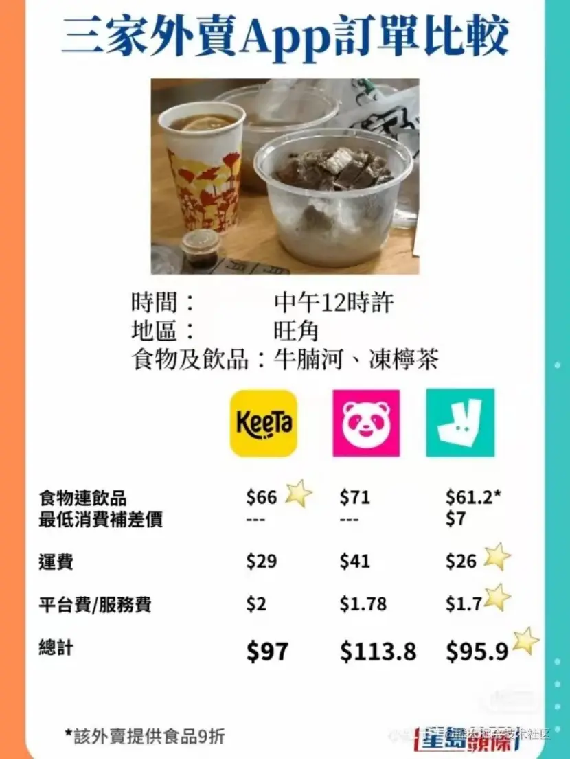 据美团香港地区的某员工透露,KeeTa上线首日截至晚8点左右,旺角地区的订单量约1500-2000单。(目前KeeTa仍处在试点阶段,仅在旺角及大角咀范围内的用户可以下单,预计到年底会覆盖整个香港。)《星港粤港通》的记者在中午12点,旺角地区,用三个外卖APP在同一餐厅,几乎同时点了牛腩粉和冻柠茶,且都没有使用优惠劵的情况下,配送时间、配送费、及最后成交价如下:Foodpanda>KeeTa>Deliveroo。