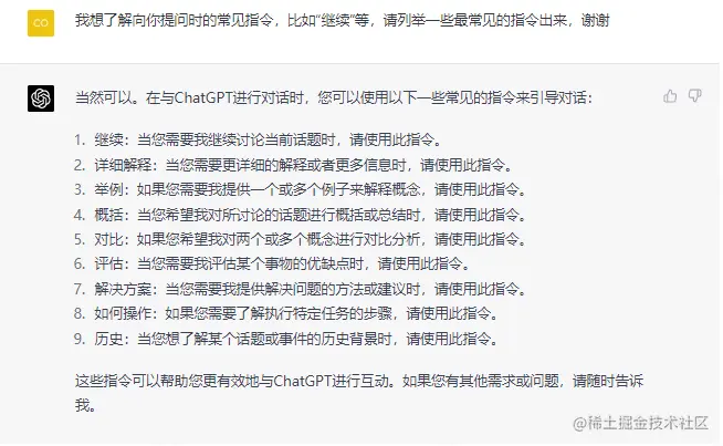 当然,知道如何精准提问后,我们也必须要知道如何使用ChatGPT指令,这个我们就可以直接问它