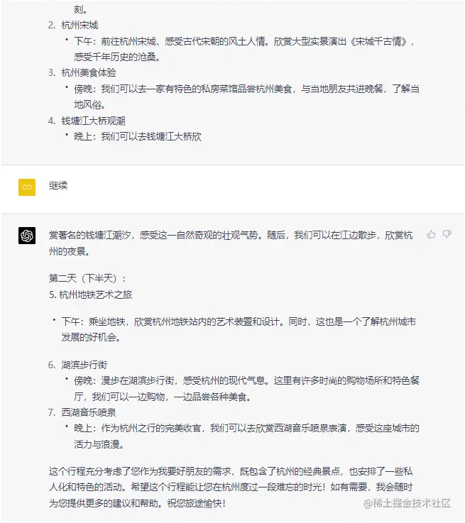可以很清晰的看出,直接让ChatGPT出攻略,它默认就泛泛而谈,攻略平铺直叙缺乏亮点;而第二段,我假设它是当地的金牌导游,而且还是我的好友,这两重身份的加持,让他的攻略详尽了很多,兼顾主流景点,也囊括了当地美食以及一些个性化安排。并一个回答都还不够,是使用了“继续”指令才能看完的,可见内容是丰富了很多的。