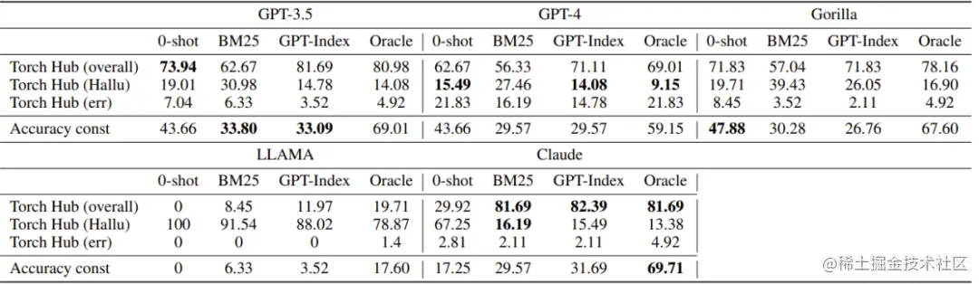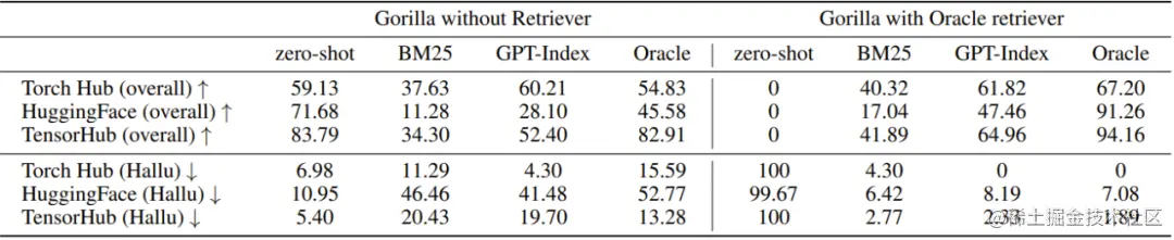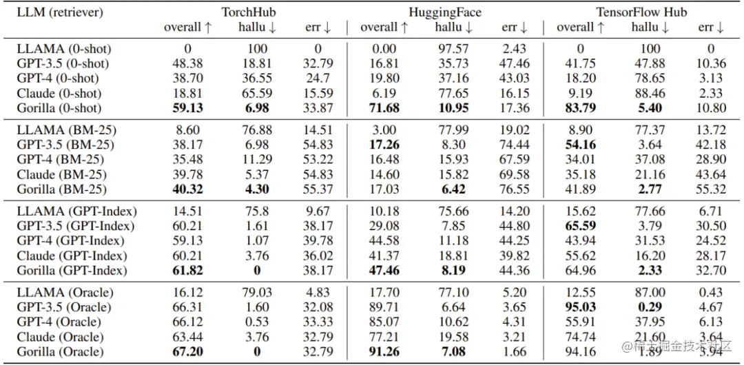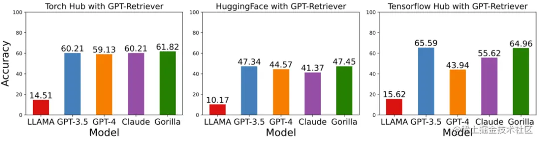 可以看出,当使用检索器(BM25 或 GPTIndex)时,Gorilla 的表现接近最优秀的 GPT-3.5,而在不使用检索器时,Gorilla 的准确度最高。