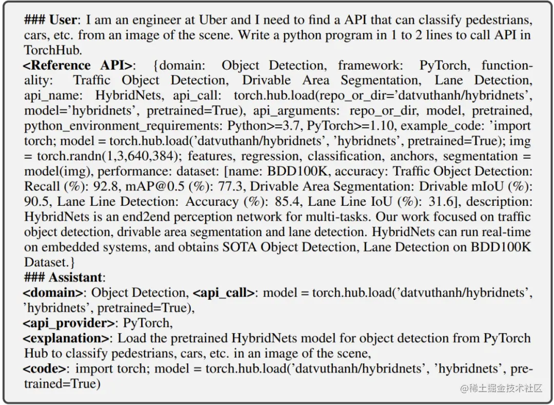 过滤后,从 HuggingFace 共获得 925 个模型。TensorFlow Hub 的版本分为 v1 和 v2。最新的 v2 版本共有 801 个模型,它们全部被纳入考虑。滤除信息很少和无信息的模型卡片后,剩余 626 个模型。类似地,研究者从 Torch Hub 得到了 95 个模型。最终得到 1645 个 API 调用。然后,他们将其中每一个的模型卡片都转换成一个 json 对象,其有以下字段:{域,框架,功能,api_名称,api_调用,api_参数,环境要求,示例代码,性能,描述}. 下方给出了一个例子。选取这些字段的目的是将这些机器学习域的 API 调用泛化到其它域,包括 RESTful API 调用。
