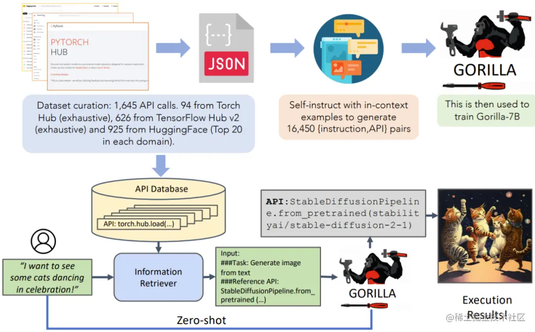 图中,上半部分是训练过程。研究者表示这是目前最详尽的机器学习 API 数据集。下半部分是推理过程;Gorilla 支持两种模式:使用检索和零样本(无检索)。在这个具体示例中,用户查询的是基于自然语言生成图像,模型能够建议出合适的 API。