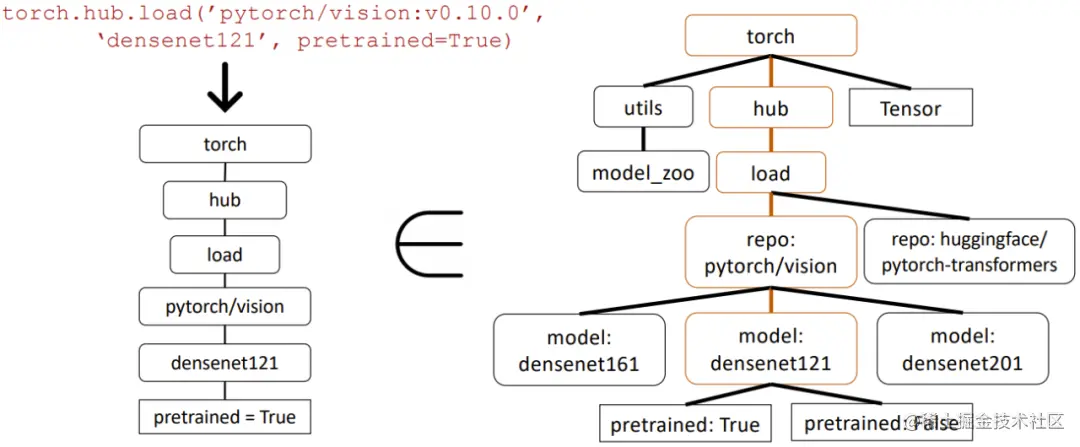 图 4 给出了更多细节。在这个例子中,Gorilla 返回了一个 torch API 调用。首先构建这个树,然后验证它与数据库中的子树匹配,即沿节点 torch.hub.load、pytorch/vision 和 densenet121 的子树。但是,这里没有检查沿叶节点 pretrained = True 的匹配情况,因为这个参数是可选的。